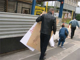 Плакаты грузили в автобус "МАЗ" с номером "с 753 хс". Несущие плакаты люди отказались отвечатьна вопрос журналиста о том, что они делают.