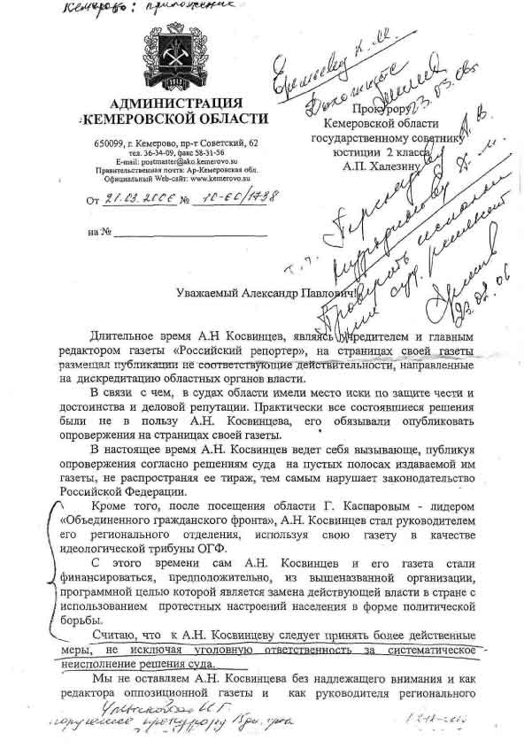 "Все это более чем странно, - заявлял тогда Косвинцев. – Для исполнения решений суда должно быть возбуждено исполнительное производство, для этого есть судебные приставы. Но никаких исполнительных листов по теме, указанной в письме прокуратуры, я как руководитель издания не получал". Между тем полученное Александром Косвинцевым письмо дает повод предположить, что у властей есть и другие к нему претензии. В частности, зампрокурора района по обращению губернатора области Амана Тулеева требует предоставить "сведения о Вашем участии в региональном отделении ОГФ, уставные и программные документы ОГФ, документы по регистрации политической организации". Текст письма Тулеева прокурору Кемеровской области, в котором он требует подвергнуть журналиста уголовному преследованию за его политическую деятельность в ОГФ и сотрудничество с Каспаровым. Текст письма можно получить по ссылке внизу.