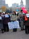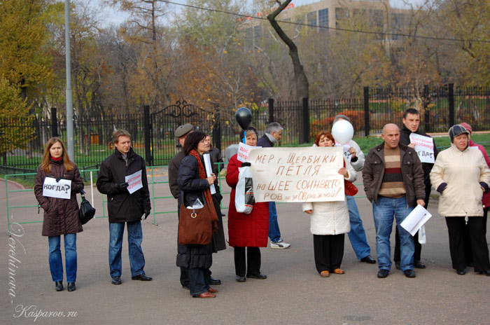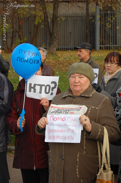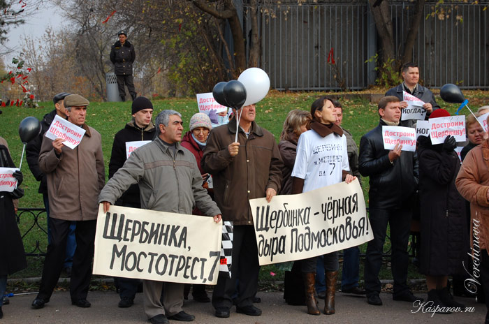 На митинге присутствовало 150 человек. Обманутые жители пришли с растяжкой "В Щербинке две тысячи бездомных семей", почти каждый держал в руках плакаты с надписями "Кто?", "Когда?". Люди скандируют "Зубков, помоги" и "Застройте Щербинку".