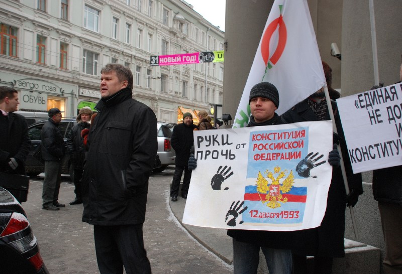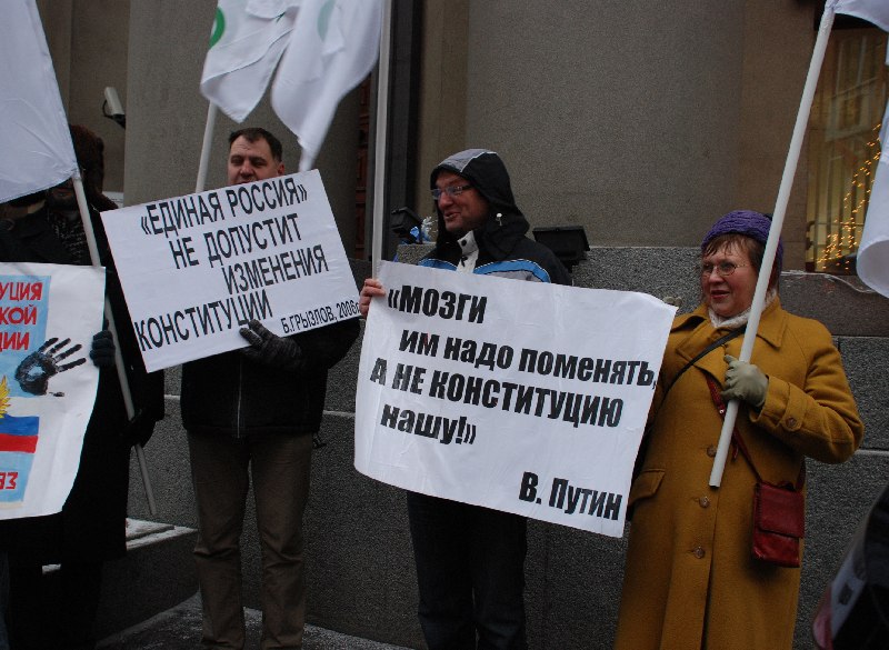 "Яблочники" скандировали лозунги: "Продление — плохо, позор депутатам!", "Меняй мозги, а не Конституцию" и "Поправки в Конституцию — это проституция!"