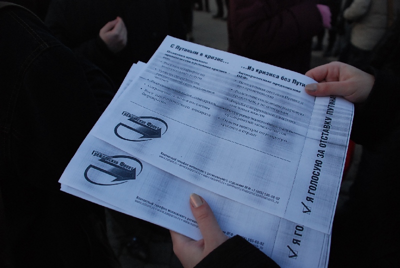 Напомним, Объединенный гражданский фронт начал серию пикетов по сбору подписей за отставку правительства. ОГФ призывает все оппозиционные движения поддержать инициативу по сбору подписей за отставку правительства во главе с премьер-министром Владимиром Путиным, которое не может предложить эффективных мер по выходу страны из кризиса. Собранные подписи будут отправлены президенту России Дмитрию Медведеву.