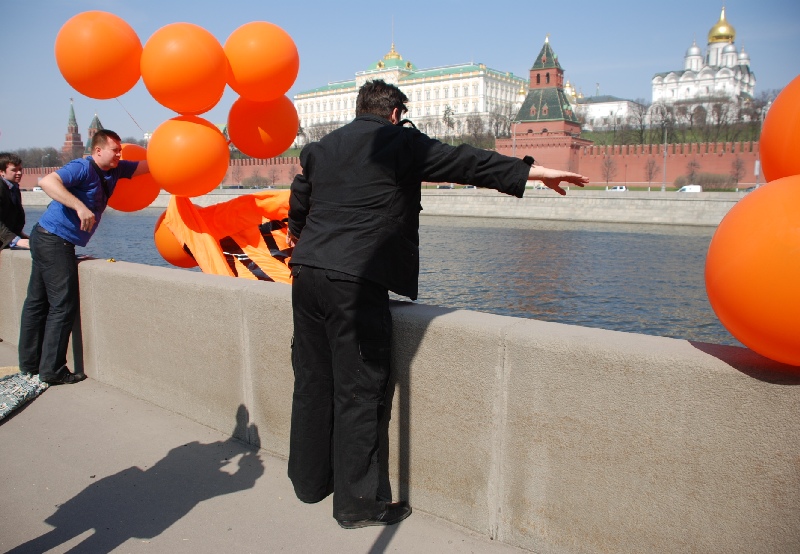 Как сообщил корреспондент, трое активистов "Солидарности" на Софийской набережной напротив Кремля спустили на воду большой оранжевый баннер "Медведев! Уволь Путина! Может быть получится!".