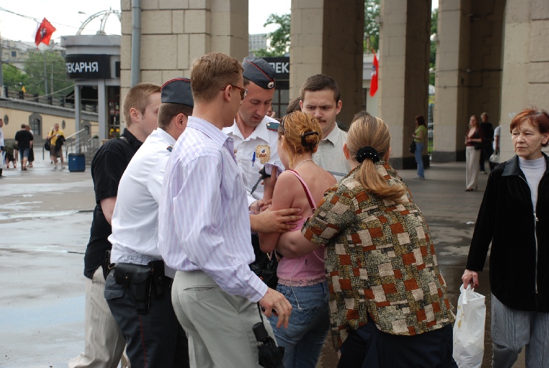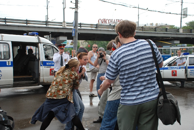 Сразу после того, как представители СКМ собрались у входа в метро, к ним подошли сотрудники милиции и, не предъявив весомых оснований, начали затаскивать их в милицейскую машину.