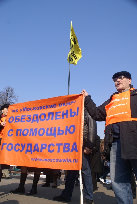 На площади присутствовали обманутые дольщики, активисты Левого Фронта, "Солидарности", партии "Яблоко" и ЛДПР.