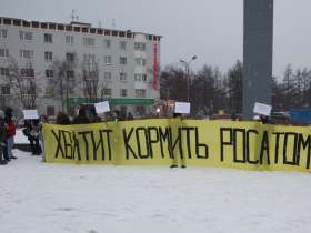 Несколько десятков активистов экологических организаций "Природа и молодежь" и "Кольский экоцентр" развернули десятиметровый транспарант "Хватит кормить Росатом". Они держали таблички, где были обозначены суммы, получаемые Росатомом из российского бюджета и от иностранных государств.