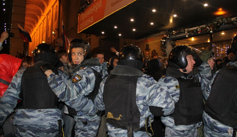 21:39 У театра Сатиры около 300 человек. Снова задержания. Корреспондент рассказывает по телефону душераздирающие подробности драки оппозиционеров с "нашистами" при участии ОМОНа.
