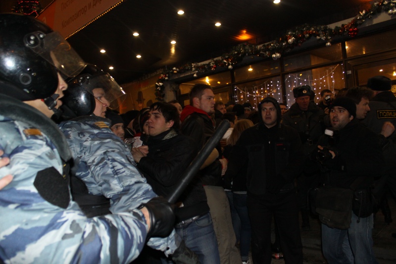 19:45 Избит также известный композитор Александр Маноцков. Задержан Сергей Митрохин. Рядом с входом в метро "Маяковская" взяли еще человек 30. В их числе две активистки "Другой России", которые пытались сжечь портрет Медведева, отобранный у "молодогвардейцев".