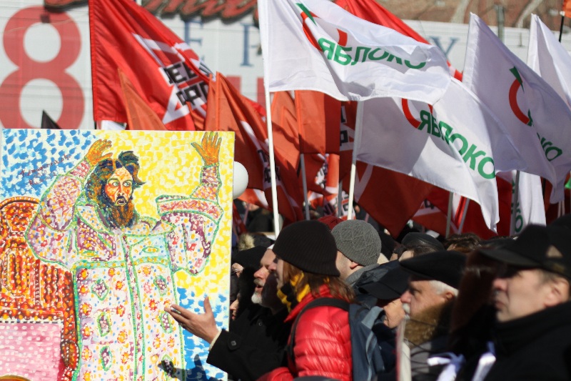 13:24 На территории митинга появилась колонна православных хоругвеносцев, передает корреспондент Каспаров.Ru. Они с деревянными крестами и непонятно за кого.