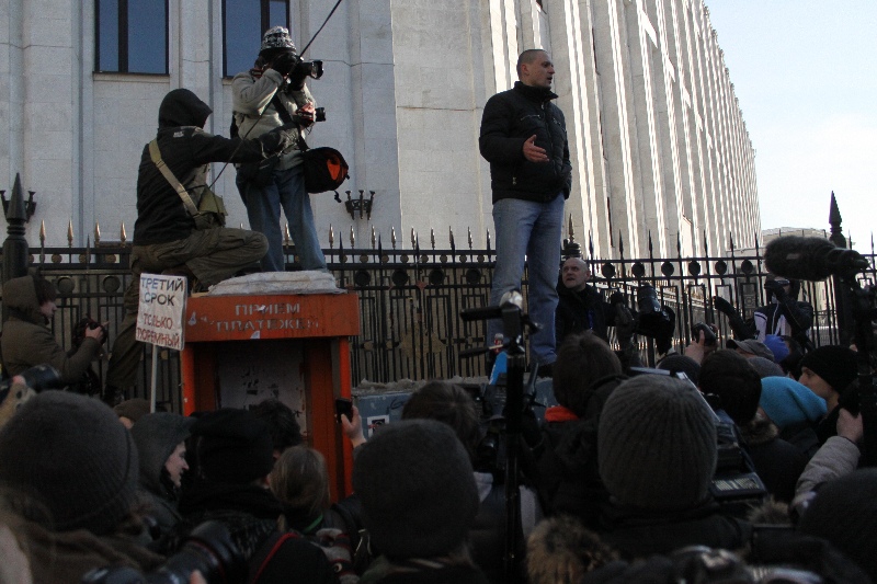 15:58 Удальцов забрался на какую-то будку, передает наш корреспондент, и, видимо, предложил остаться там ввиду того, что все перекрыто. Некий полковник попросил его слезть, но Удальцов продолжил обращаться к толпе.