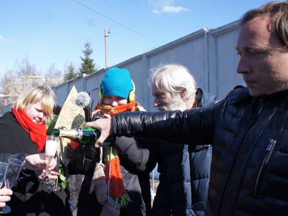 Остальные активисты и группа поддержки остались у ограждений. Встречать невесту вышел адвокат Ковязина Руслан Чанидзе, с ним вместе прошли свидетели, а также мамы Жени и Леонида.
