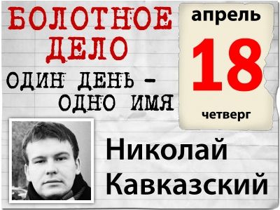 18 апреля – день солидарности с Николаем Кавказским в рамках кампании "Болотное дело: один день – одно имя". Николай, оказывавший ранее активную помощь узникам "Болотного дела", сам был арестован по этому делу. С 25 июля 2012 года он находится под арестом в СИЗО.