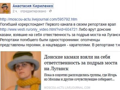 Погибший корреспондент Первого канала в своем репортаже врал. Либо врут донские казаки, взявшие на себя отвественность за подрыв моста на Луганск.