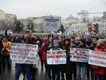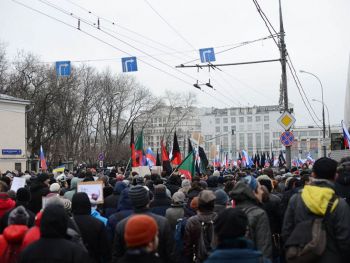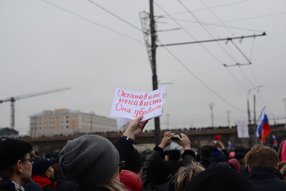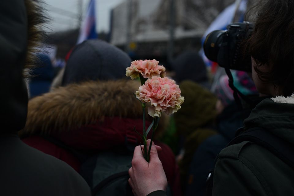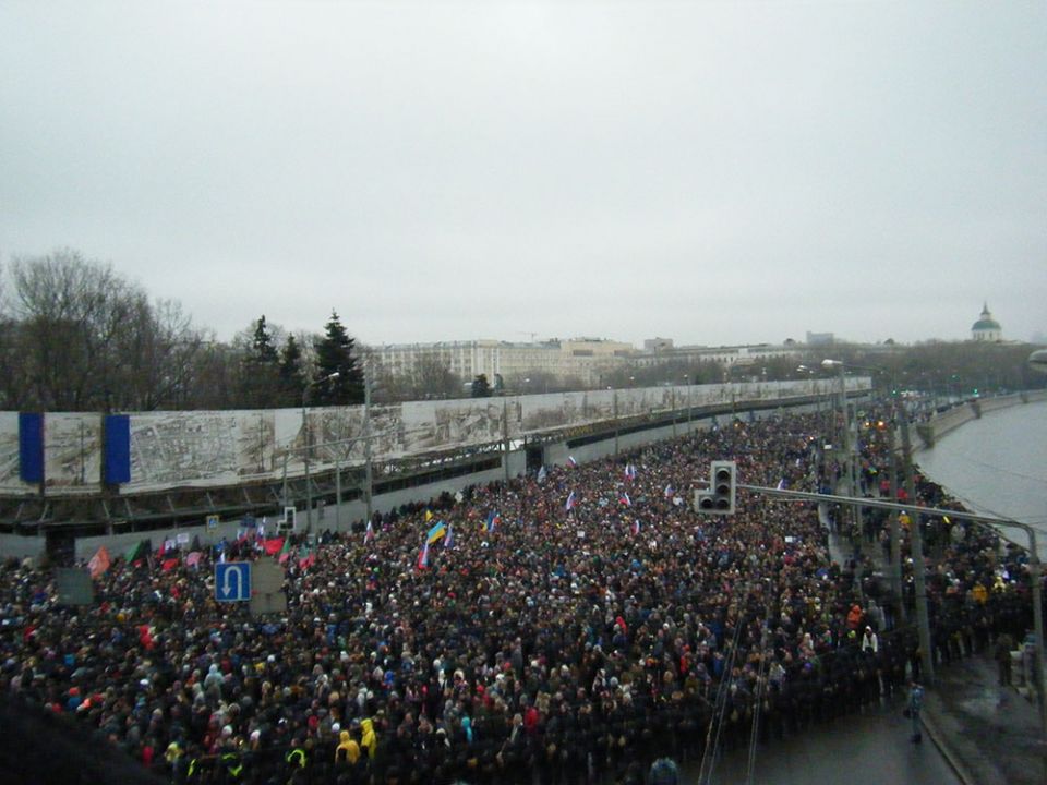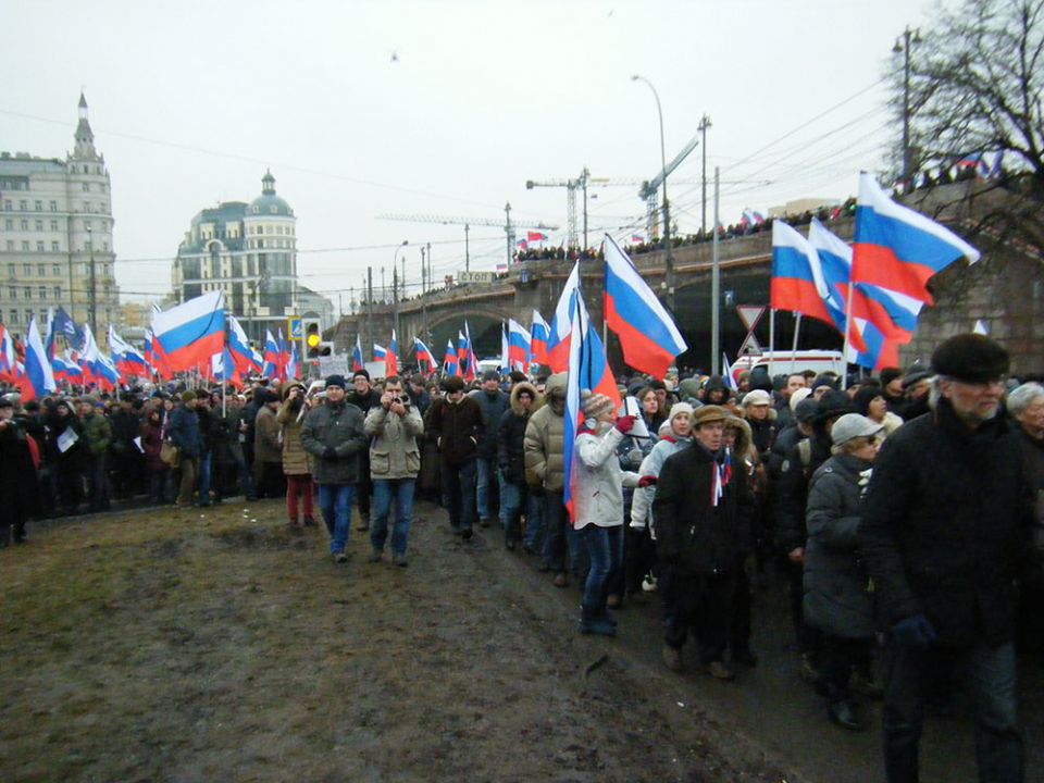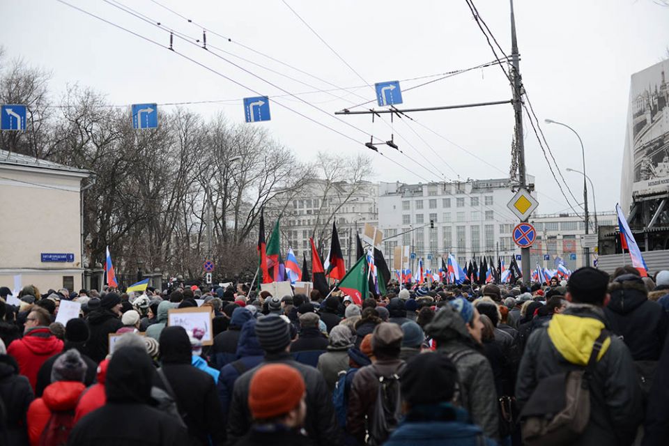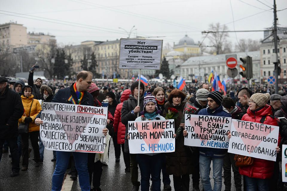 В траурном шествии памяти Бориса Немцова в Москве приняли участие десятки тысяч человек. Колонны людей прошли от Славянской площади по Москворецкой набережной к Большому Москворецкому мосту, где был убит политик. Участники несли растяжки "Герои не умирают" и "Эти пули - в каждого из нас". Многие держали в руках портреты Немцова и флаги России с траурными ленточками. Шествие памяти политика прошло вместо марша "Весна".