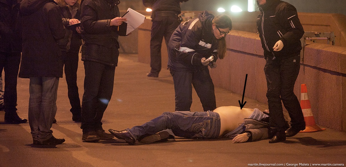 "ВХОДНЫЕ отверстия в одежде есть все: почти все они со стороны спины и одно со стороны левого бока. Никаких входных отверстий от пуль со стороны груди и живота нет, что свидетельствует о выстрелах в спину (один – в левый бок) и нахождении стрелявшего сзади и несколько слева от Б.Е.Немцова".