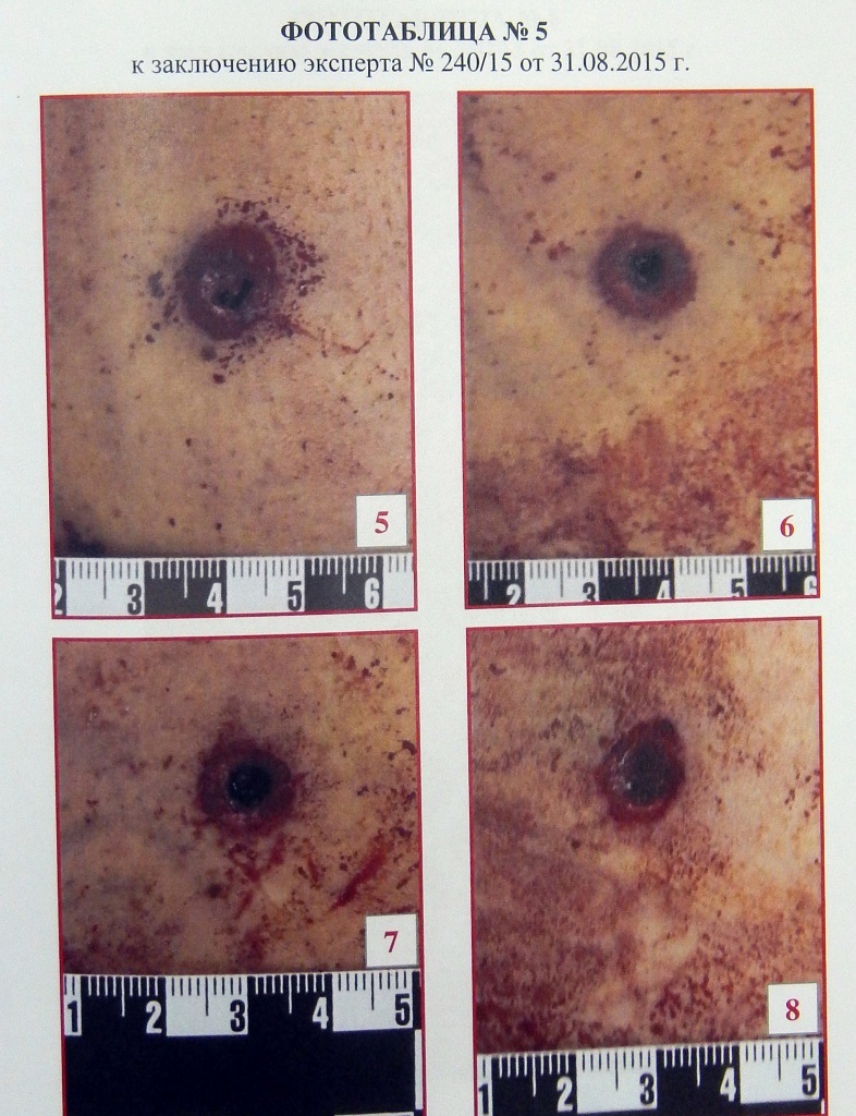 И далее я представил три фотографии с пулевыми отверстиями, по которым каждый может сопоставить местонахождение отверстий на фото, с ее же нумерацией на схеме